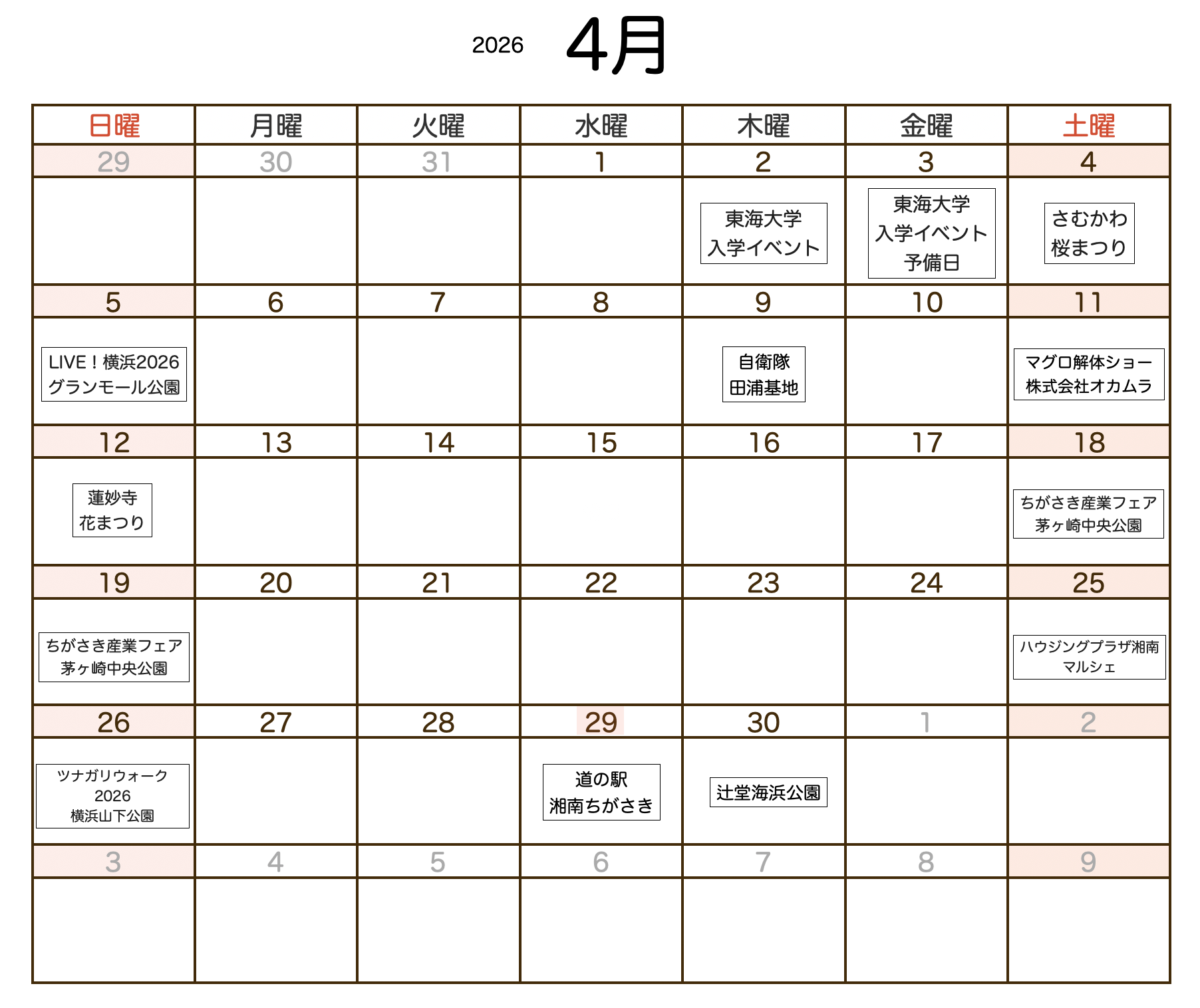 ユニディ湘南平塚店、関東女子フットサルリーグ(シンコースポーツ寒川アリーナ)、スポーツフェスタ(カルぺソール湘南スポーツクラブ)、BRANCH茅ヶ崎、大磯クリテリウム(大磯ロングビーチ)、愛川ふるさと祭り(愛川町役場)、キッチンカーデイズ(藤沢駅サンパレット広場)、聳塔祭(文教大学)、浜大祭(横浜市立大学)、Clean & Green(サザンビーチ)、ねんりんピック(柳島スポーツ公園)、柳島キャンプ場市民無料開放DAY(柳島キャンプ場)、第5回海街フェス(平塚 ママ・フルーツ)、展示会(ニチガス秦野デポステーション)、C SIDE Marche(テラスモール湘南)、東横イン(平塚、茅ヶ崎)、クリスマスマルシェ(茅ヶ崎市役所前広場)、フリーマーケット(七里ヶ浜)、ミスターマックス湘南藤沢店、新春凧揚げ大会(サザンビーチ)、Jリーグサッカーフェスティバル(横須賀リーフスタジアム)、やまか松林店、ツクイサンフォレス辻堂西海岸、節分祭(前鳥神社)、自動運転カート体験乗車(横須賀リサーチパーク)、プレミスト湘南辻堂、クリエイトSD藤沢鵠沼海岸店、笛田公園、アーバンリビング相模原、Tokai Entrance Festival 2023(東海大学)、花見会(前鳥神社)、やまか玉縄店、市役所マルシェ(茅ヶ崎市役所)、駅前フードジャーニー(三浦海岸駅)、春の里山公園祭り(里山公園)、南郷上ノ山公園、寒川キッチンカーパーク、東海大学、つるのこマルシェ(鶴嶺神社)、グランアリーナレジデンス、里の家マルシェ(里山公園)、防衛大学、BMW横須賀支店、コスギアイハグ、厚木文化会館、金沢プール、資生堂レディスオープン2023、國學院大学、ひがし参道マルシェ(興全寺)、八坂神社例大祭子どもまつり(前鳥神社) 、寒川ウォーターパーク、グランドメゾン東戸塚、平塚市しおかぜ広場、茅ヶ崎シーサイドマルシェ(茅ヶ崎漁港駐車場多目的広場)、茅ヶ崎サザン通り、茅ヶ崎霊園マルシェ(湘南公園墓地)、三菱電機新人歓迎会、寒川一宮小学校夏祭り、JX金属葉月祭、50周年記念夏祭り(浜之郷公園)、茅ヶ崎北陵高校文化祭、向上高等学校文化祭、水曜どうでしょうキャラバン(第一カッターきいろ公園)、田端スポーツ公園、イセハライチ(伊勢原市総合運動公園)、高砂コミュニティーセンター、キッチンカーグルメ選手権(国営昭和記念公園)、グランモール公園、大相撲伊勢原場所(伊勢原市総合運動公園)、日本生命逗子営業部、海上自衛隊第二科学校オープンスクール、ブリージアテラス淵野辺、町田グランベリーパーク、第一回さむかわ天才万博(さむかわ川とのふれあい公園)、平塚プレジール、ミモザ平塚徳延、アフリカモン(遊行寺)、ちがさき消防防災フェスティバル(第一カッターきいろ公園)、アルバックフェスティバル、セントガーデン海老名、橘学苑中学高校、横浜銀行アイスアリーナ、七福神巡りイベント(妙傳寺)、キングベルパーク(第一カッターきいろ公園)、水仙祭り(県立城ヶ島公園)、新春ふれあいフェスタ(境川遊水地公園)、小出川桜まつり、ブランシエール湘南辻堂、ららテラス武蔵小杉、東海大学医学部附属病院、かながわ伝統文化こども歳時記(神奈川県立青少年センター)、小出川桜まつり、さむかわカレー祭り、ブランシエール湘南辻堂、ダイワハウス住宅展示場、大庭城址公園、小山町湘南祭り(豊門公園)、東海大学卒業式、さむかわ桜まつり(寒川中央公園)、海上自衛隊田浦地区、日枝神社(平塚市寺田縄)、ひがし参道花祭り子供マルシェ(興全寺)、成就院花まつり、湘南厚木病院、秦野市クライングパーク、丹沢マルシェ(県立秦野戸川公園)、親水公園、浄見寺地元まつり、愉快爽快たや店、DOG&GOLF(多摩川ゴルフ倶楽部)、辻堂海浜公園、桂台GENKI満天フェスタ(桂山公園)、さむかわフードトラックフェスティバル(寒川駅前公園)、麻溝公園ふれあい動物広場、リリーズガーデン(茅ヶ崎市役所)、綾瀬市文化会館フェスティバル2024、茅ヶ崎里山マルシェ、スーパーオートバックス厚木)、江ノ島小田急ヨットクラブ、みつばちマルシェ(鶴嶺八幡宮)、ミナカ小田原、海上自衛隊横須賀基地、グルメカレー祭り(茅ヶ崎市役所)、AGC株式会社納涼祭、ユキデアソビナ(ららぽーと海老名)、いすゞ自動車夏祭り、愛川町勤労祭、日産フェア(日産モータースポーツ&カスタマイズ)、湘南しんきん祭り(茅ヶ崎市役所)、キッチンカーNo.1グランプリ(茅ヶ崎中央公園)、津田塾祭、柳島しおさい公園、サンクスギビングフェスタ(上府中公園)、慶應大学矢上キャンパス、アルバックフェスティバル、わんにゃんマルシェ(茅ヶ崎中央公園)、遊びリパークリノア、輝く湘南辻堂フェスティバル(湘南モールフィル)、神奈川大学みなとみらいキャンパス、茅ヶ崎公園、東京医科大学八王子医療センター、茅ヶ崎海岸新春祭(サザンビーチ)、湘南桂台自治会どんど焼き、どんど焼き(鶴嶺八幡宮)、(株)銘林 木材展示会、メルセデス・ベンツ湘南、キコーナ茅ヶ崎、広尾ガーデン、MINI町田鶴川店、理化学研究所、こすぎコアパーク、東邦チタニウム、陸上自衛隊武山駐屯地、開成町駅前、茅ヶ